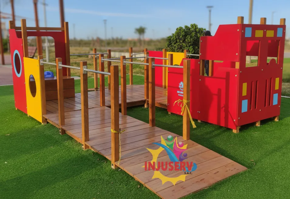 El Módulo Inclusivo Bombero es una estructura de juego diseñada con elementos seguros y duraderos, como madera huayruro y fibra de vidrio. Ideal para fomentar la inclusión y el juego activo en áreas recreativas.