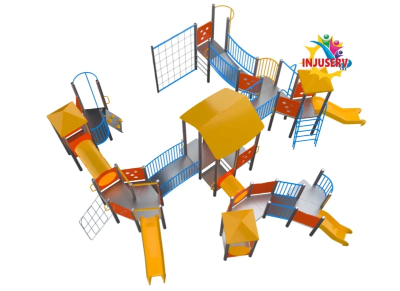 Mega-Estructura Institucional: El complejo más robusto de la línea de acero, diseñado para un alto flujo de usuarios (6 a 13 años) y con una vida útil excepcional al aire libre.