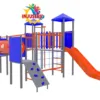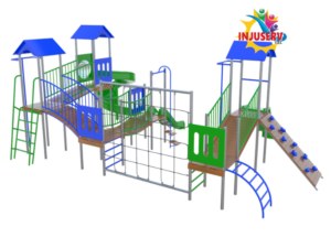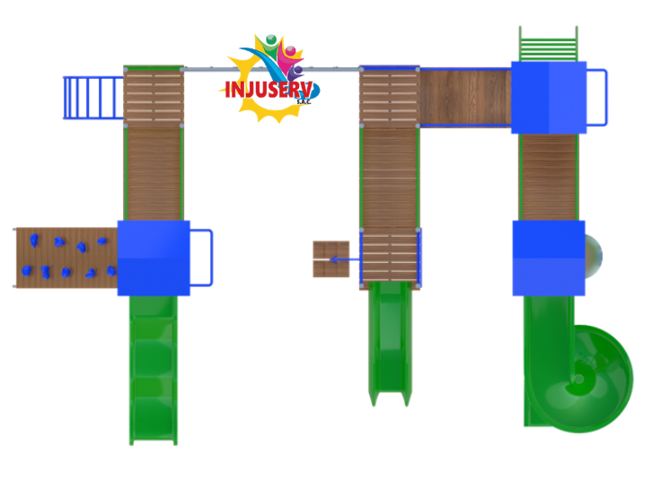Este modelo representa el máximo nivel de juego recreativo, diseñado como un circuito de aventura continuo que integra tres torres y múltiples zonas de desafío. Su estructura extendida permite el juego simultáneo de un gran número de usuarios, combinando puentes colgantes, redes de escalada y zonas de deslizamiento en un diseño industrial de acero nacional ultra resistente.