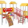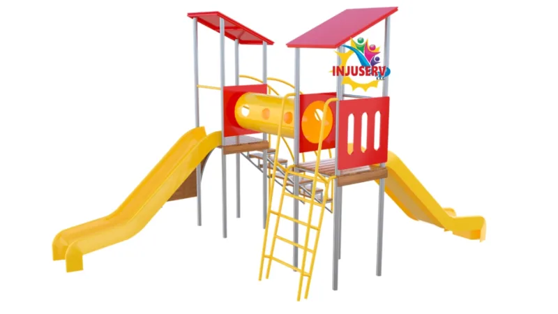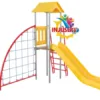 Estación Recreativa de Equilibrio: Diseñada como un circuito de aventura completo que optimiza el espacio mediante una estructura de doble torre interconectada, permitiendo un flujo dinámico de usuarios.
