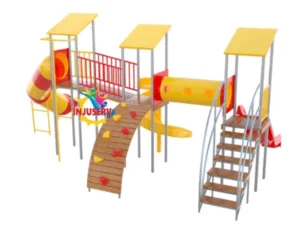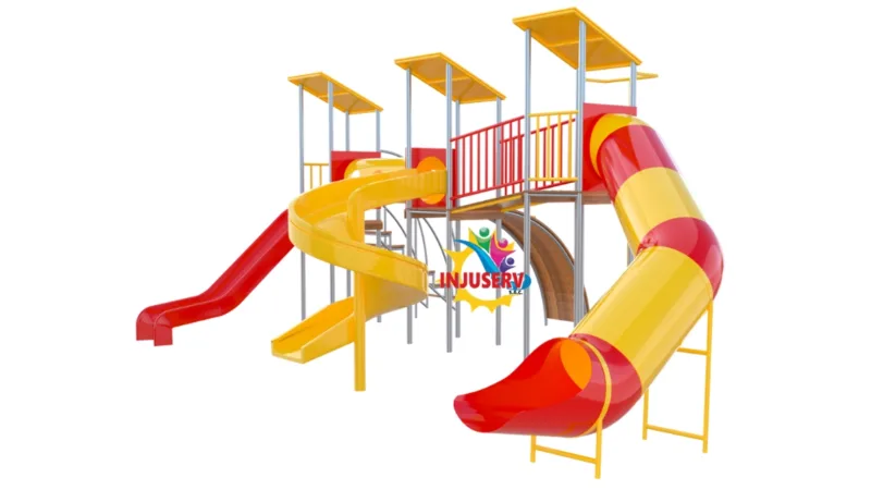 Este modelo representa una de las estaciones más completas y elevadas de la línea, diseñada para ofrecer un flujo constante de aventura en parques de alto tránsito. Su configuración integra tres torres de gran altura interconectadas por puentes de seguridad, combinando un tobogán en espiral con deslizadores rectos para maximizar la diversión y el desafío físico.