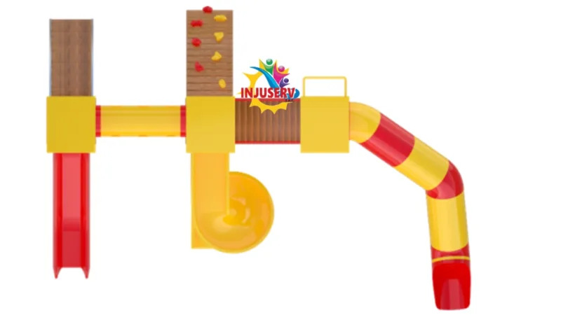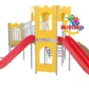Experiencia de Deslizamiento Múltiple: Sistema de salidas de alto impacto que incluye un tobogán caracol abierto de gran altura, un tobogán cerrado curvo gigante bicolor (amarillo/rojo) y toboganes rectos de largo alcance estratégicamente ubicados.